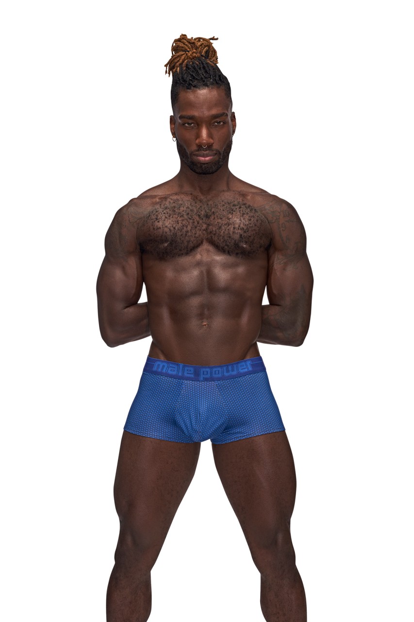 From the Sexagon collection by Male Power the Mini Short features a low cut waist, high cut legs, contour pouch and a plush branded printed waistband. Poly spandex hexagon print fabric with micro pin hole perforations for moisture wicking and cool breathability, plush branded elastic waistband. Hand wash separately, cold water, line dry, no bleach