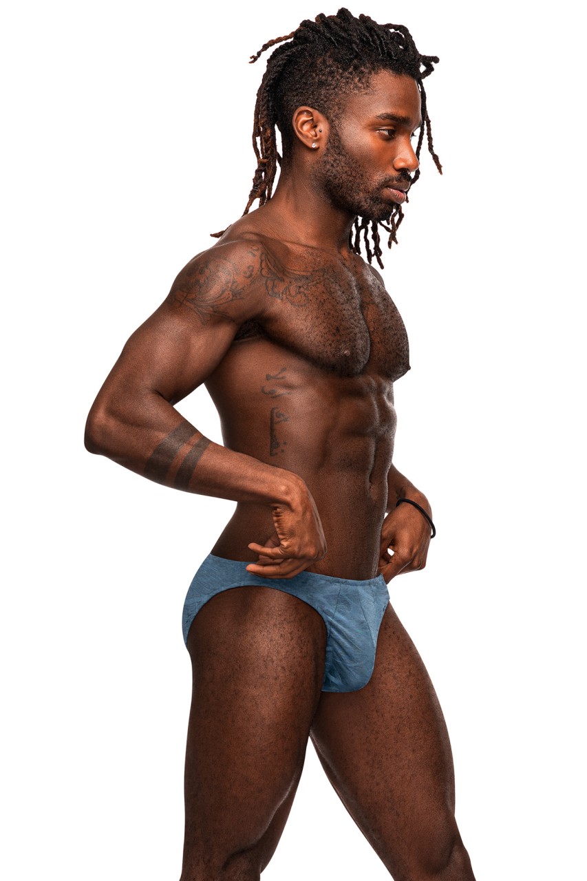 From the Male Power Inter-mingle collection this style includes a Moonshine jock brief with a low cut waist, a contour pouch and an exposed rear. Cool stretch poly spandex with an embossed tone on tone print joining both flat and raised graphics throughout. Hand wash separately, cold water, line dry, no bleach. 93% Polyester 7% Spandex